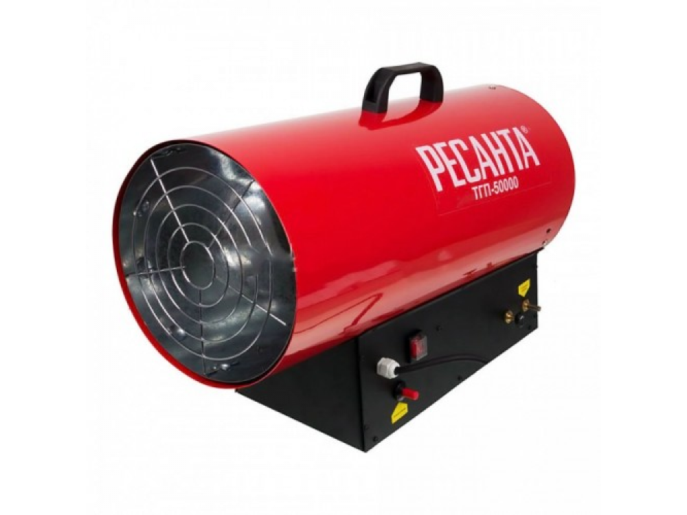 Газовая тепловая пушка РЕСАНТА ТГП-50000 – воздухонагреватель, работающий на сжиженном газовом топливе. Топливо необходимо для получения горячей атмосферы в камере сгорания, а электроэнергия, подводимая к устройству, необходима для питания вентилятора, нагнетающего воздух, и для функционирования автоматики. Газовые пушки прямого нагрева являются простой и надёжной конструкцией без дымохода, где горячий воздух из устройства поступают в помещение.